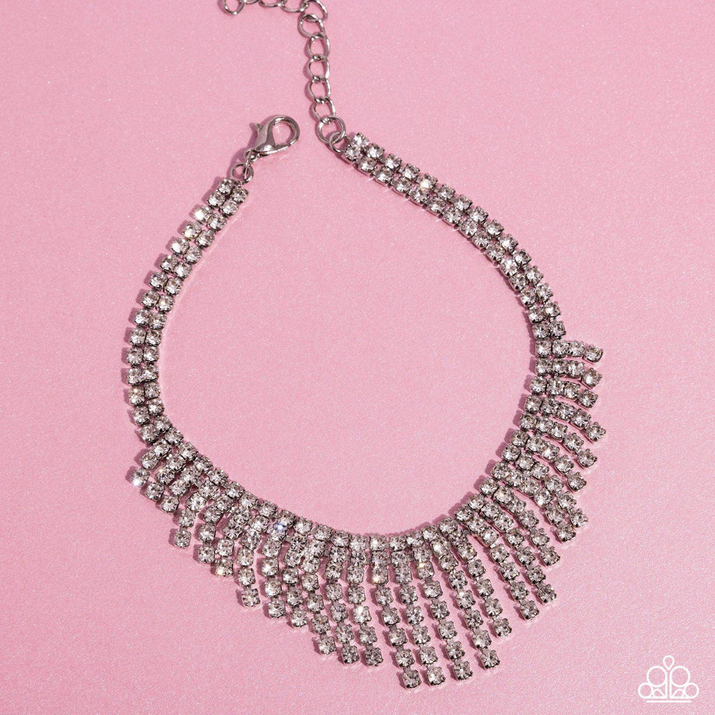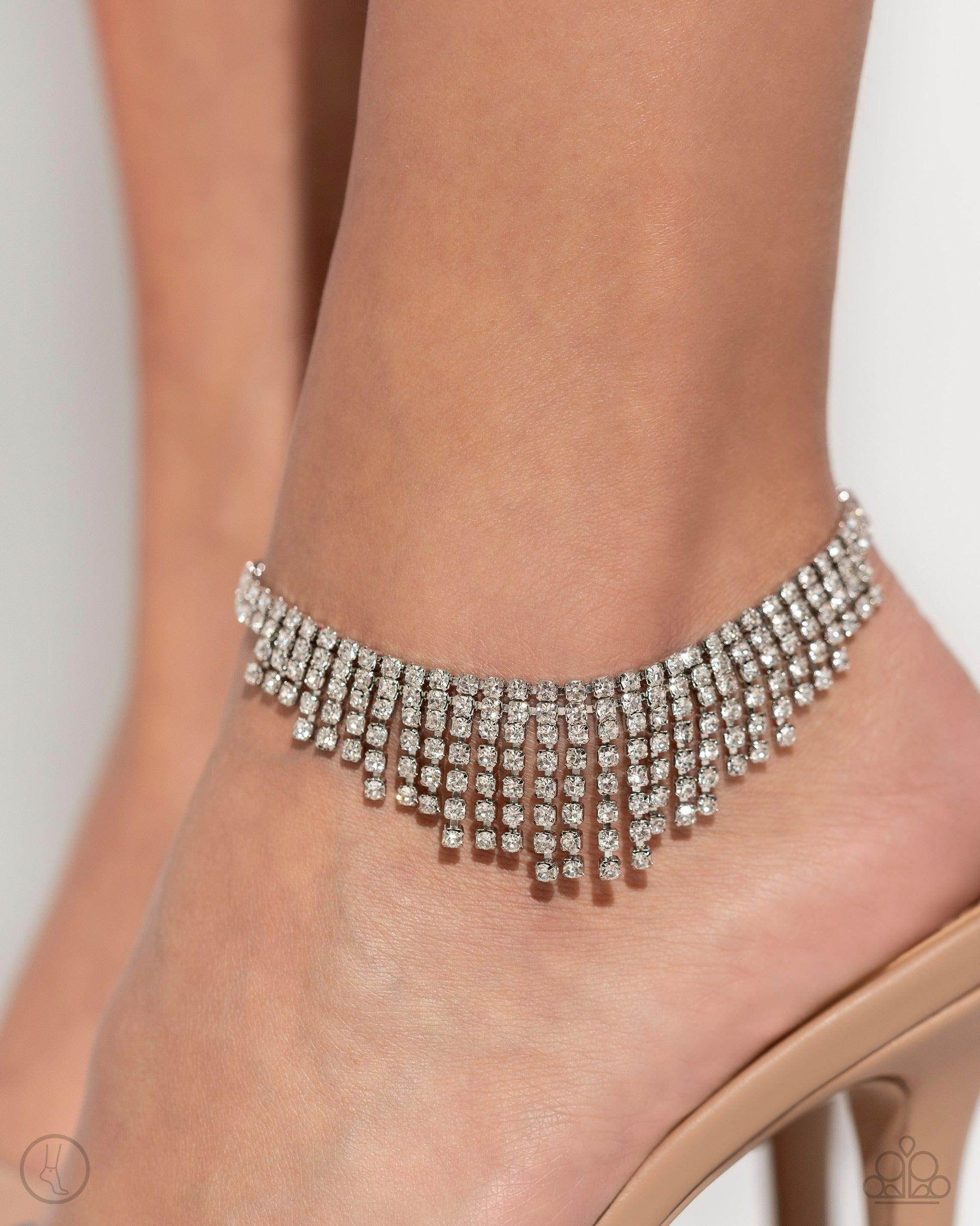 A sassy curtain of mismatched white rhinestone-encrusted silver box chains tapers from the bottom of a double-stranded dramatic row of glassy white rhinestones delicately pressed in silver square fittings. The exaggerated fringe cascades around the ankle, resulting in a dauntless attitude that demands attention with every swish. Features an adjustable clasp closure.