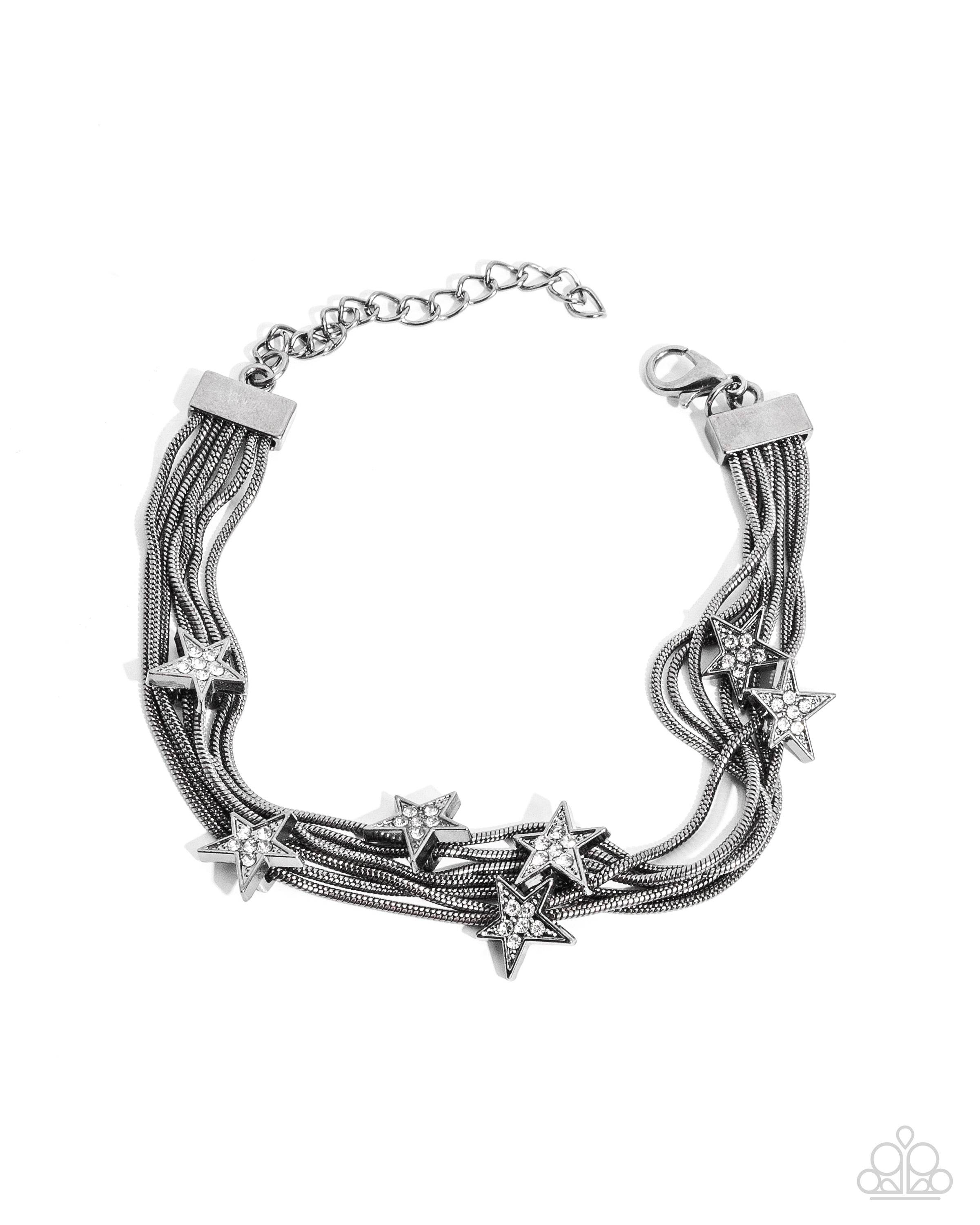 Embellished in white rhinestones and gunmetal studs, a collection of glistening gunmetal stars is infused along copious strands of gunmetal snake chains for a sassy stellar look along the wrist. Features an adjustable clasp closure.
