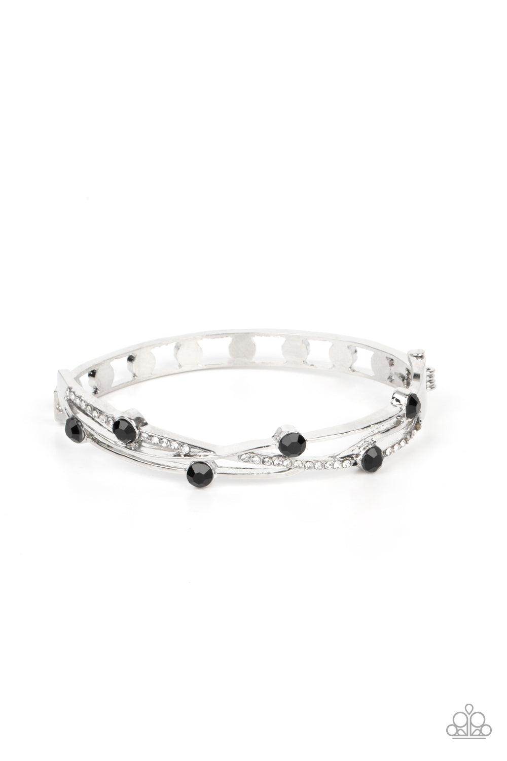 Dotted with glittery black rhinestones, smooth silver and white rhinestone dotted ribbons delicately intertwine into a decorative bangle-like bracelet around the wrist. Features a hinged closure.