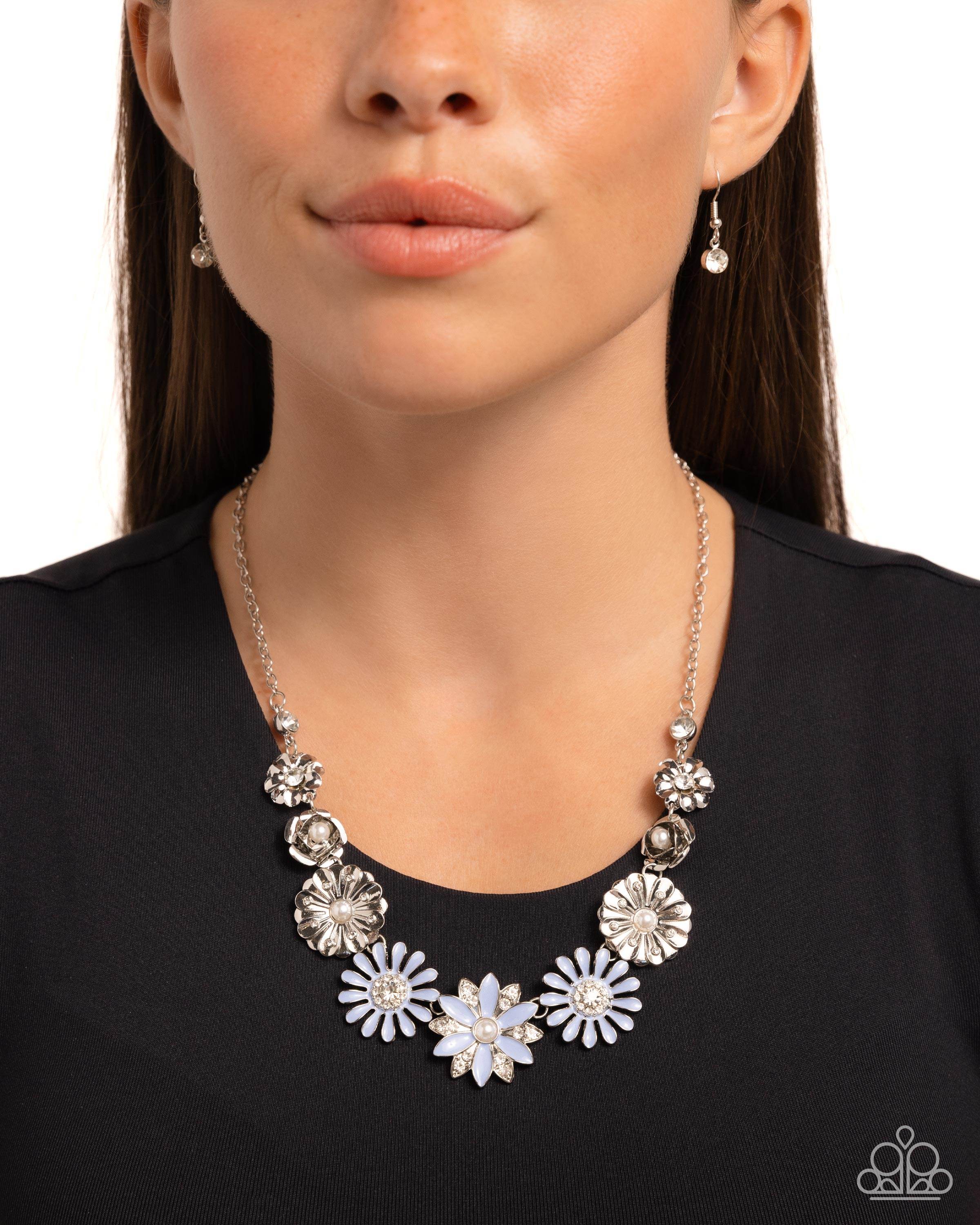 A row of silver and Chambray Blue-painted flowers blooms to life along the collar, creating a vibrant statement piece. Each flower features a different centerpiece, flawlessly sprinkling the design with whimsical sparkle and shimmery pearls. Silver edging outlines some of the layered petals, emphasizing the handcrafted character of the design. Features an adjustable clasp closure.