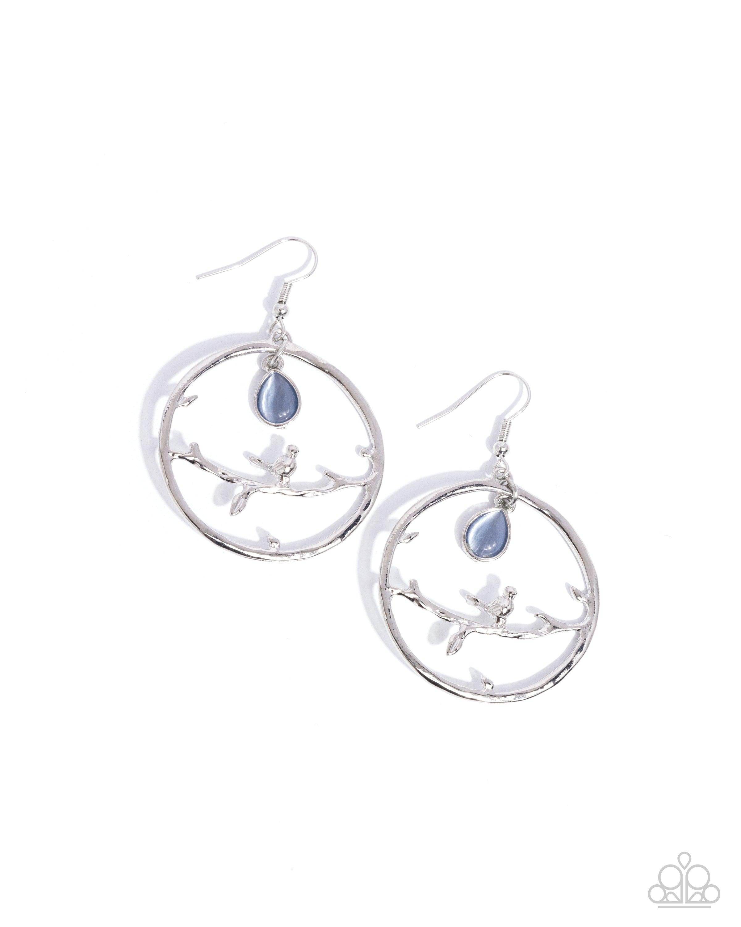 Pressed in a silver teardrop frame, a blue cat's eye stone is suspended below a subtly hammered silver hoop. A charming three-dimensional silver bird is perched atop a silver leafy branch that extends across the middle of the silver hoop, while solitaire leaves extend around the inner circumference, resulting in a perfectly picturesque display. Earring attaches to a standard fishhook fitting.