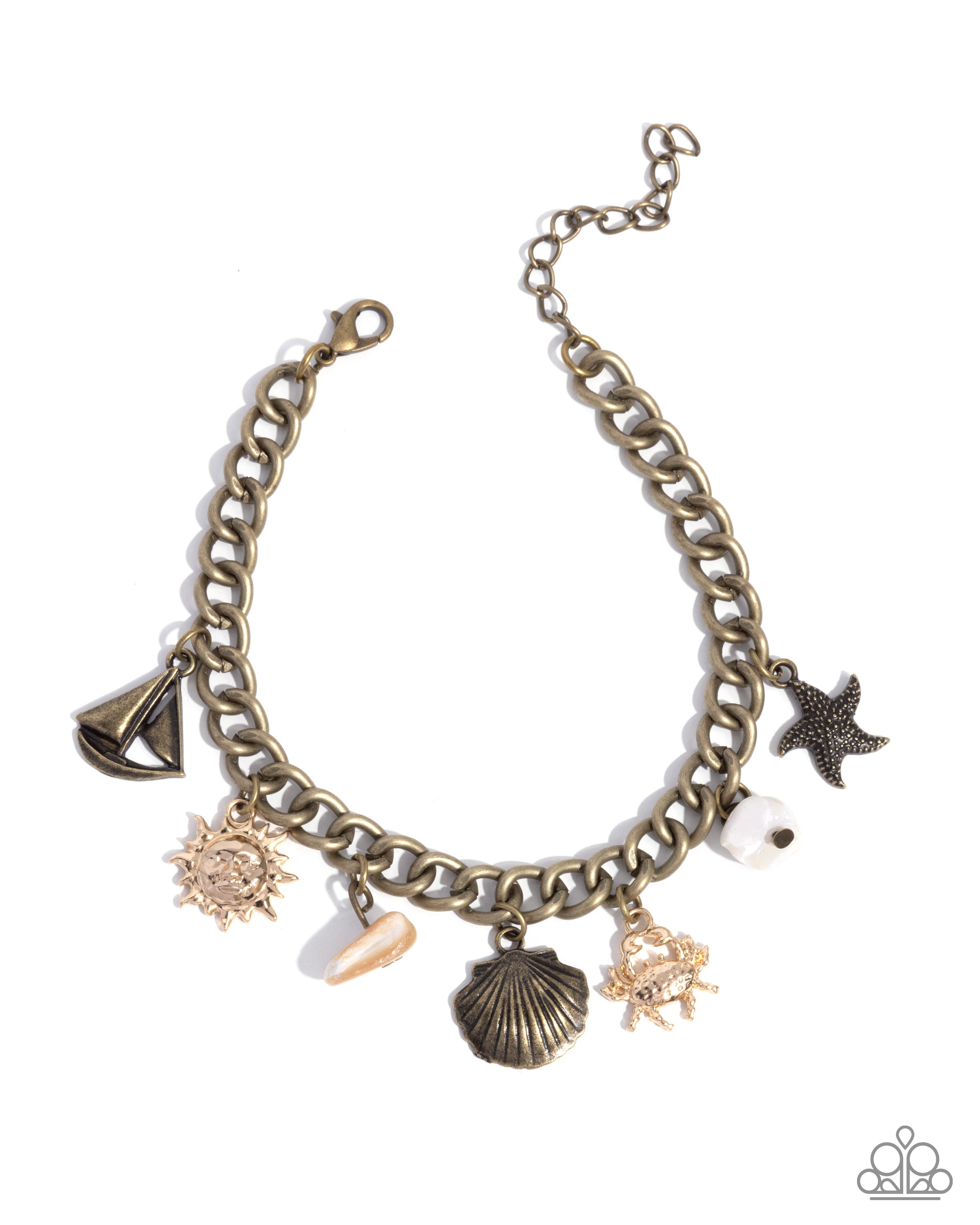 A chunky brass chain is adorned with a collection of nautical-inspired charms, including a brass sail boat, a golden sun with a serene face, white pebble-like stones, a brass shell, a gold crab, and a dot-textured brass starfish. Features an adjustable clasp closure.