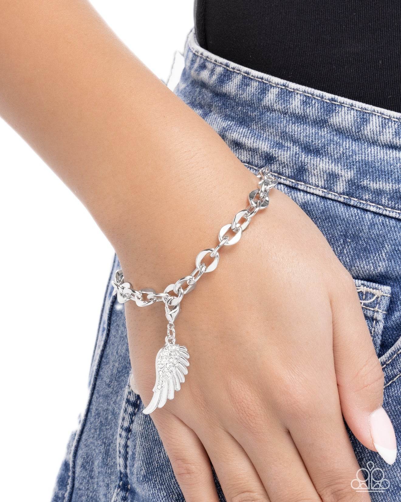 Dusted in white rhinestones, a rhodium plated angel wing reflects light in every direction. Features a clasp closure. Can be attached to a variety of chains for a celestially chic look. Charm measures approximately 1" in length.