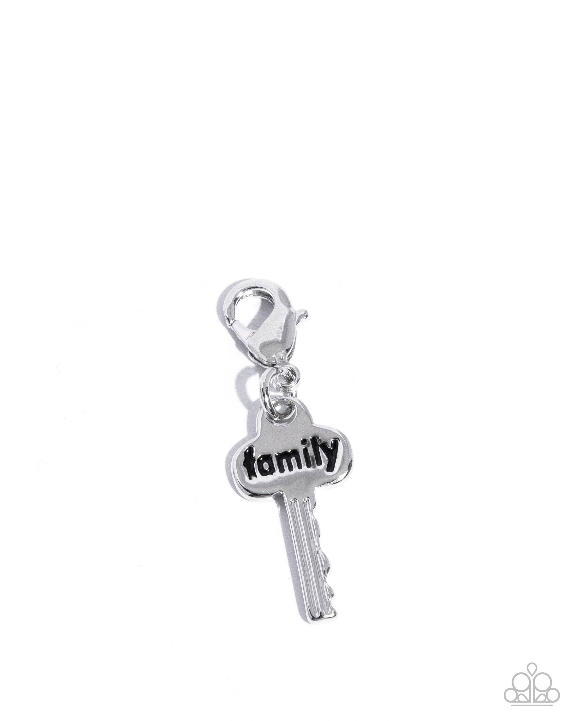 Stamped with the black-painted word "family," a glistening rhodium plated key reflects light in every direction. Features a clasp closure. Can be attached to a variety of chains for a home-inspired haute design. Charm measures approximately 3/4" in length.