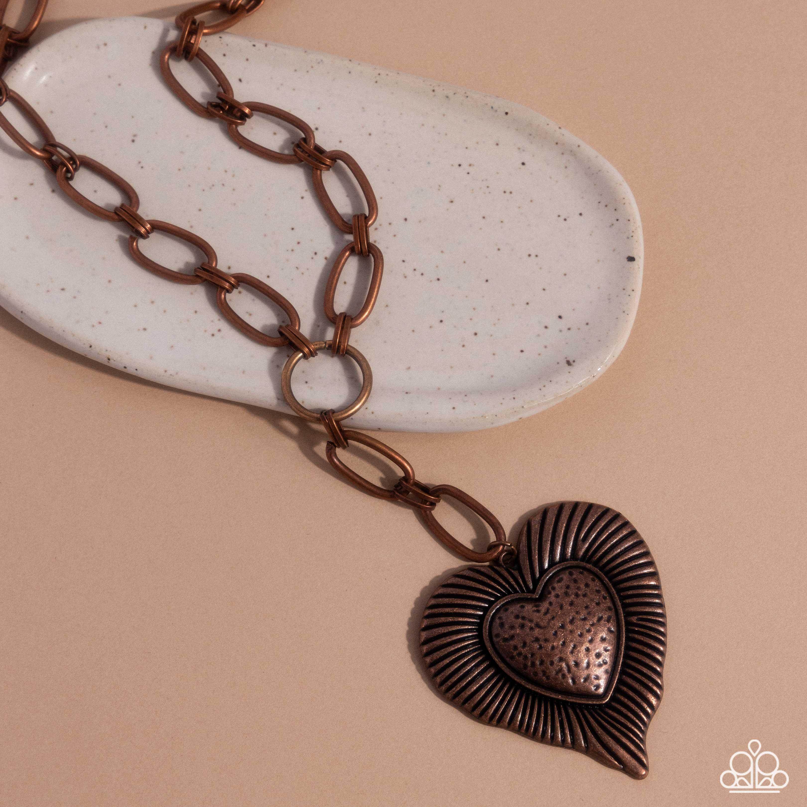 Connected by doubled copper jump rings, elongated copper paperclip chain links cascade around the neckline, extending to an oversized fluted copper heart pendant with a dot-hammered center for a rustically romantic look. Features an adjustable clasp closure.
