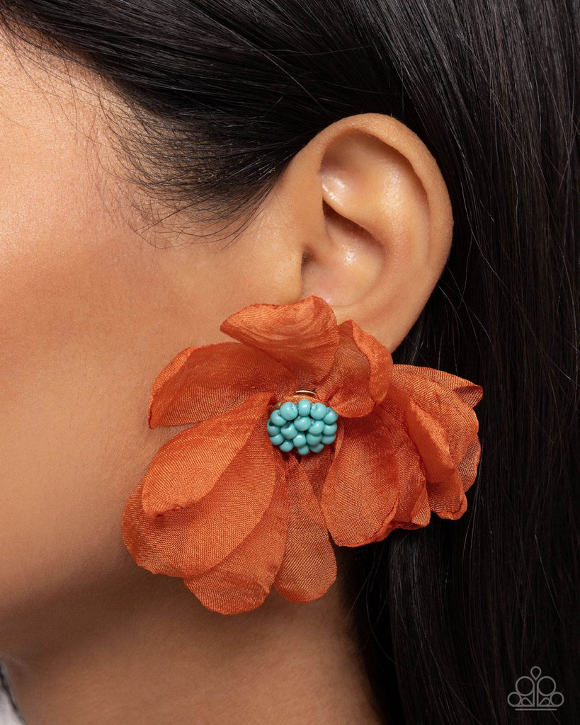 Featuring tiffany seed beads, Tomato Cream tulle petals flair out along the ear for a whimsically wondrous look. Earring attaches to a standard post fitting.