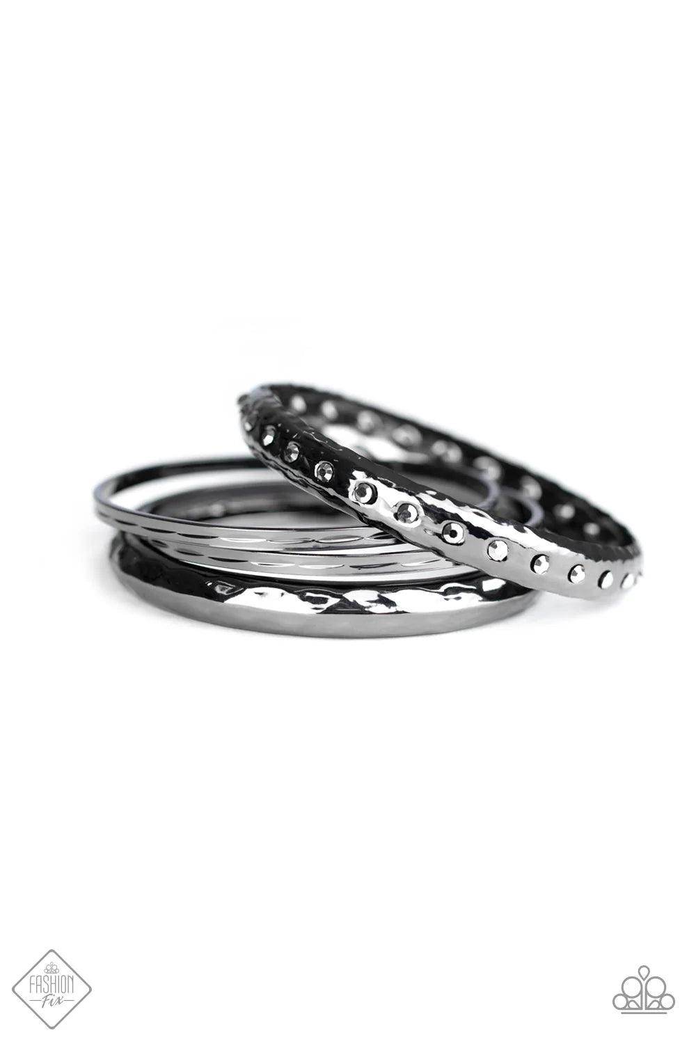 A stack of gunmetal bangles is hammered in texture, creating light-catching edges that reflect an immense amount of shine. One bangle is lined with glassy white rhinestones, adding a hint of twinkle.