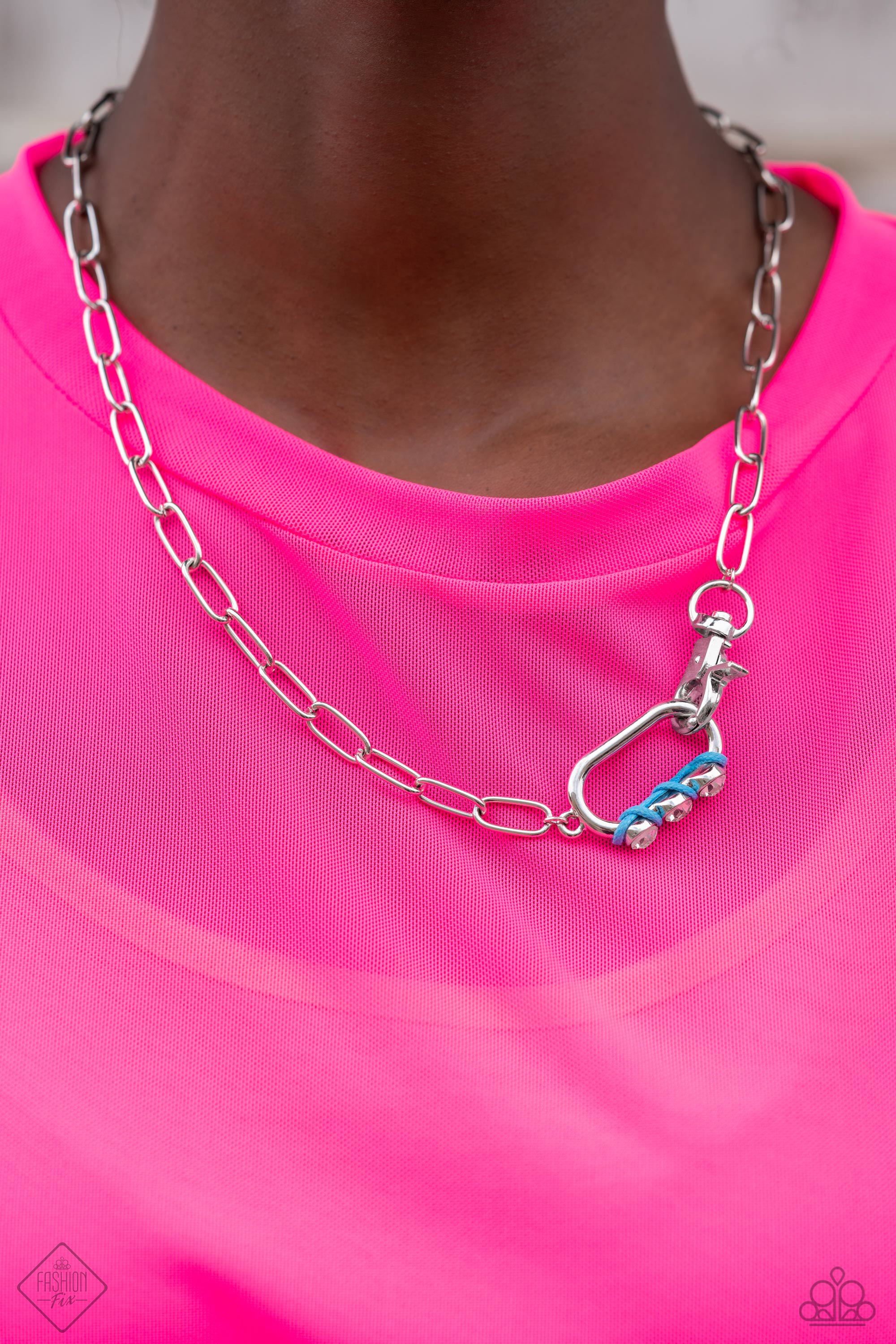 Sleek, elongated silver links lead the eye down to an oversized silver carabiner frame. Encrusted along the bottom curve of the silver hardware, a trio of gems, woven across blue cording, glimmers for a subtle pop of color down the neckline. Features a clasp closure.