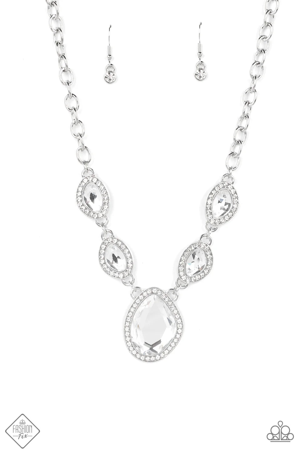 Bordered in silver frames dotted with tiny flecks of white rhinestones, a pair of asymmetrical white gems delicately link into a spellbinding sparkle around the neck. Features an adjustable clasp closure.
