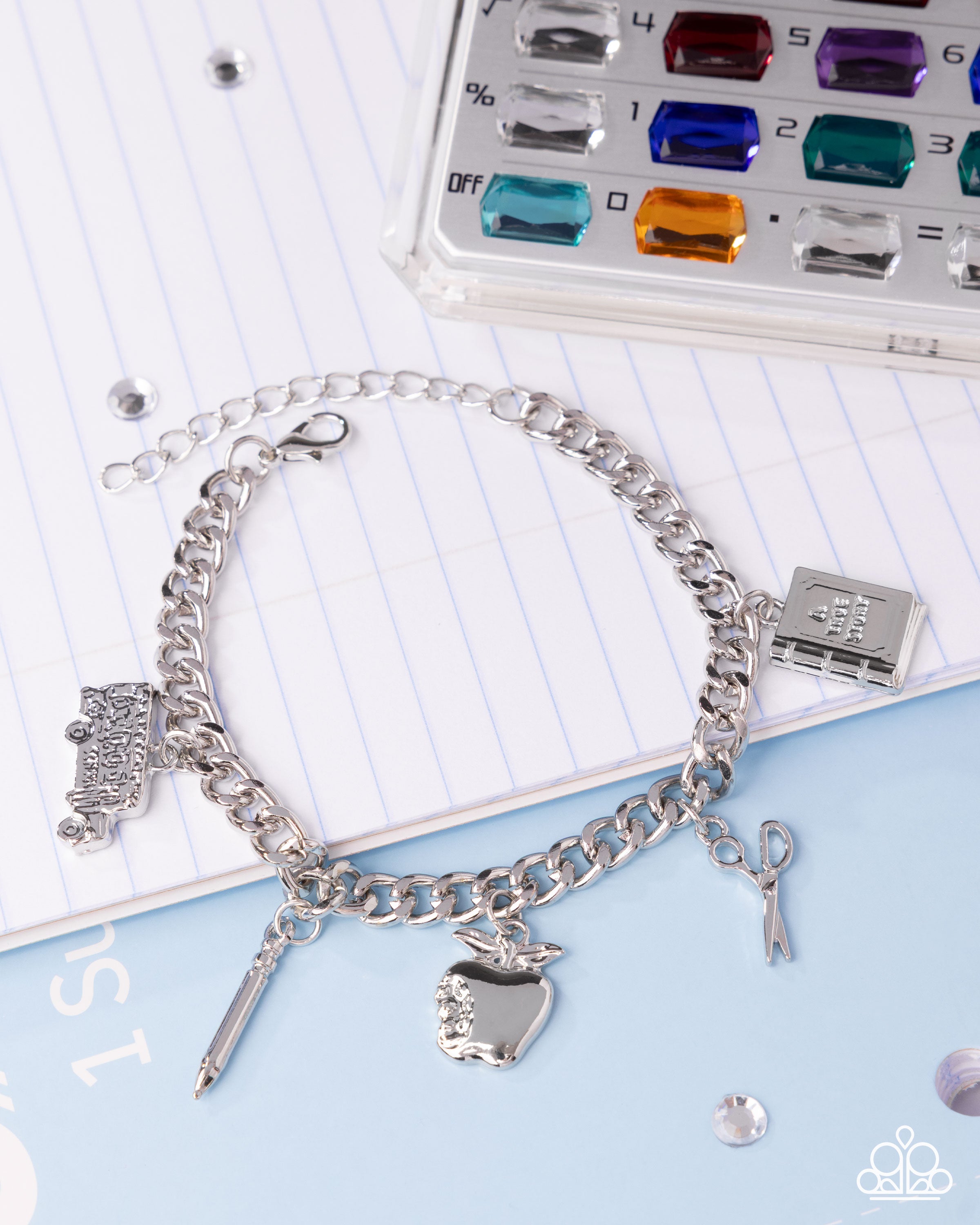 Swaying along a silver curb chain, a collection of monochromatic silver charms including a school bus, a pencil, a pair of scissors, a book, and a bitten apple with a hammered indent creates a striking school-inspired statement. Features an adjustable clasp closure.