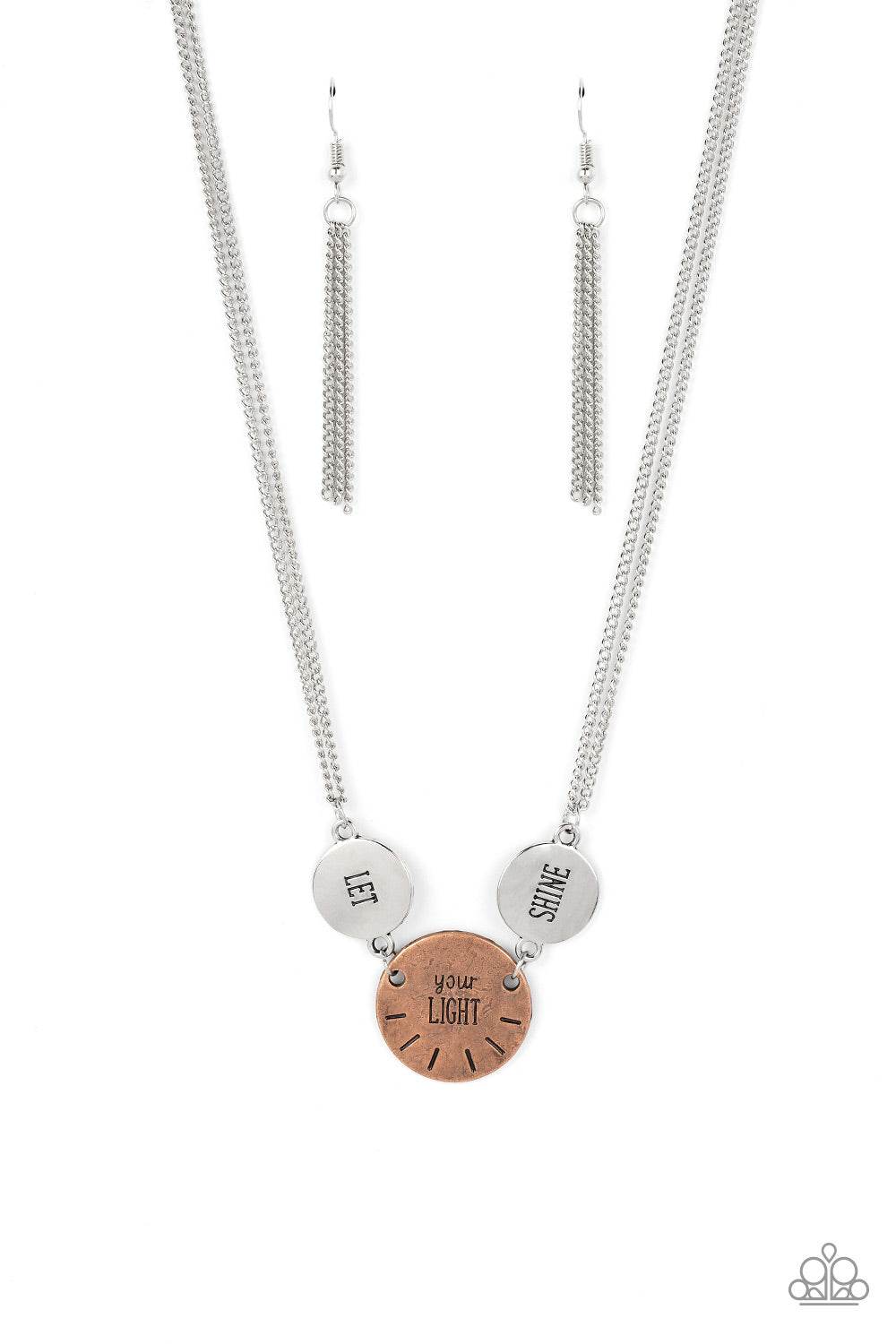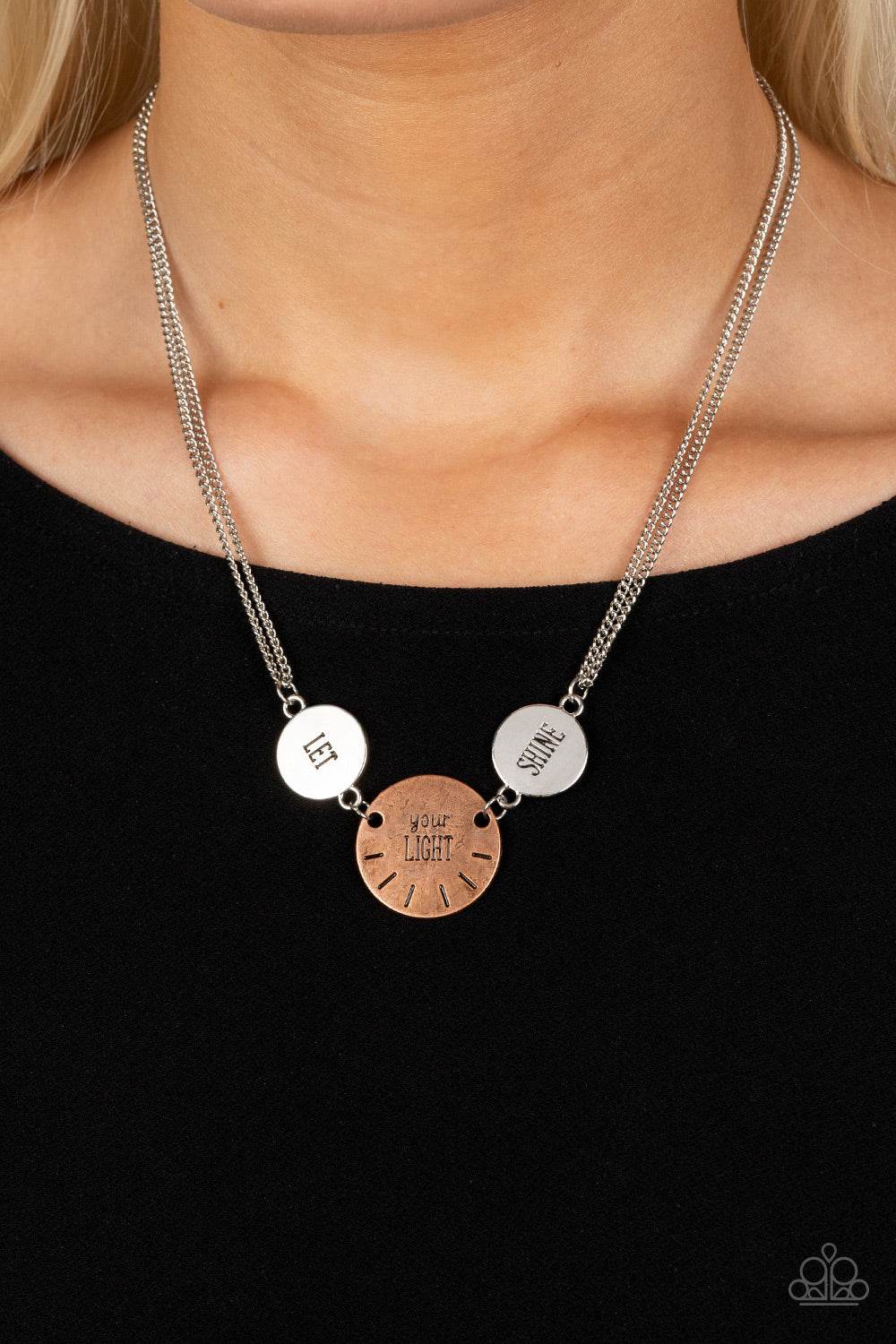 Individually stamped in "Let," "Your Light," Shine," a pair of shiny silver discs links with a single copper disc, combining into an inspirational phrase below the collar. Features an adjustable clasp closure.