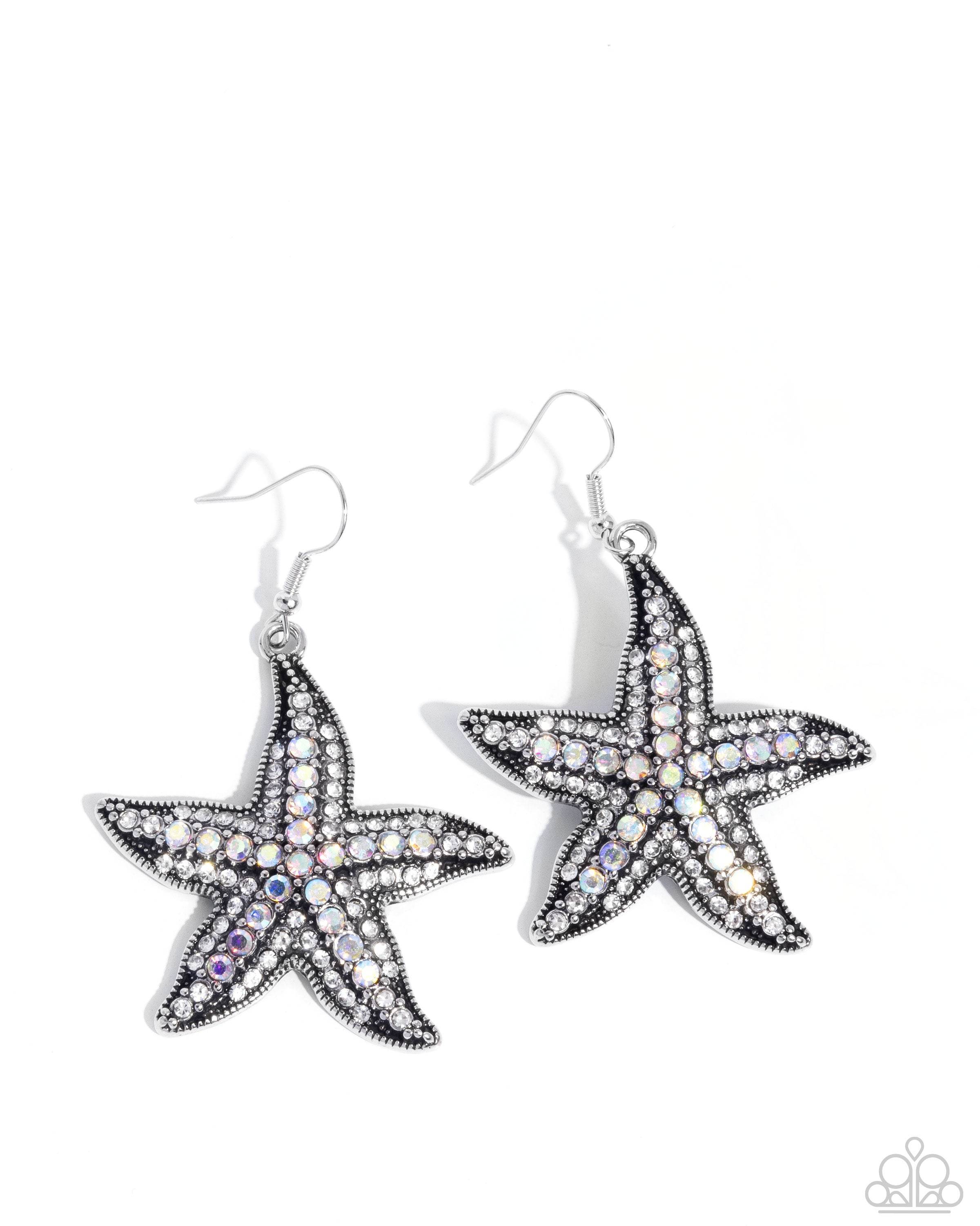 Shimmering with iridescent and white rhinestones, the silver starfish frames exude coastal charm. The textured silver finish and sparkling rhinestone accents create a dazzling seaside-inspired look. Earring attaches to a standard fishhook fitting.