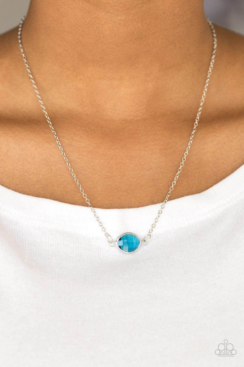 Featuring a regal marquise style cut, a glassy blue gem attaches to two shimmery silver chains, creating a stationary pendant below the collar for a refined look. Features an adjustable clasp closure.
