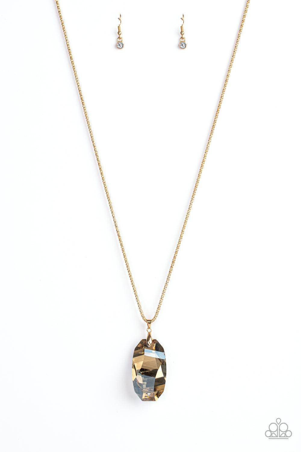 Featuring a raw cut and metallic backing, a golden gem swings from the bottom of an elongated gold popcorn chain. Dotted with a dainty white rhinestone, the faceted gem catches and refracts the light for a blinding finish. Features an adjustable clasp closure.