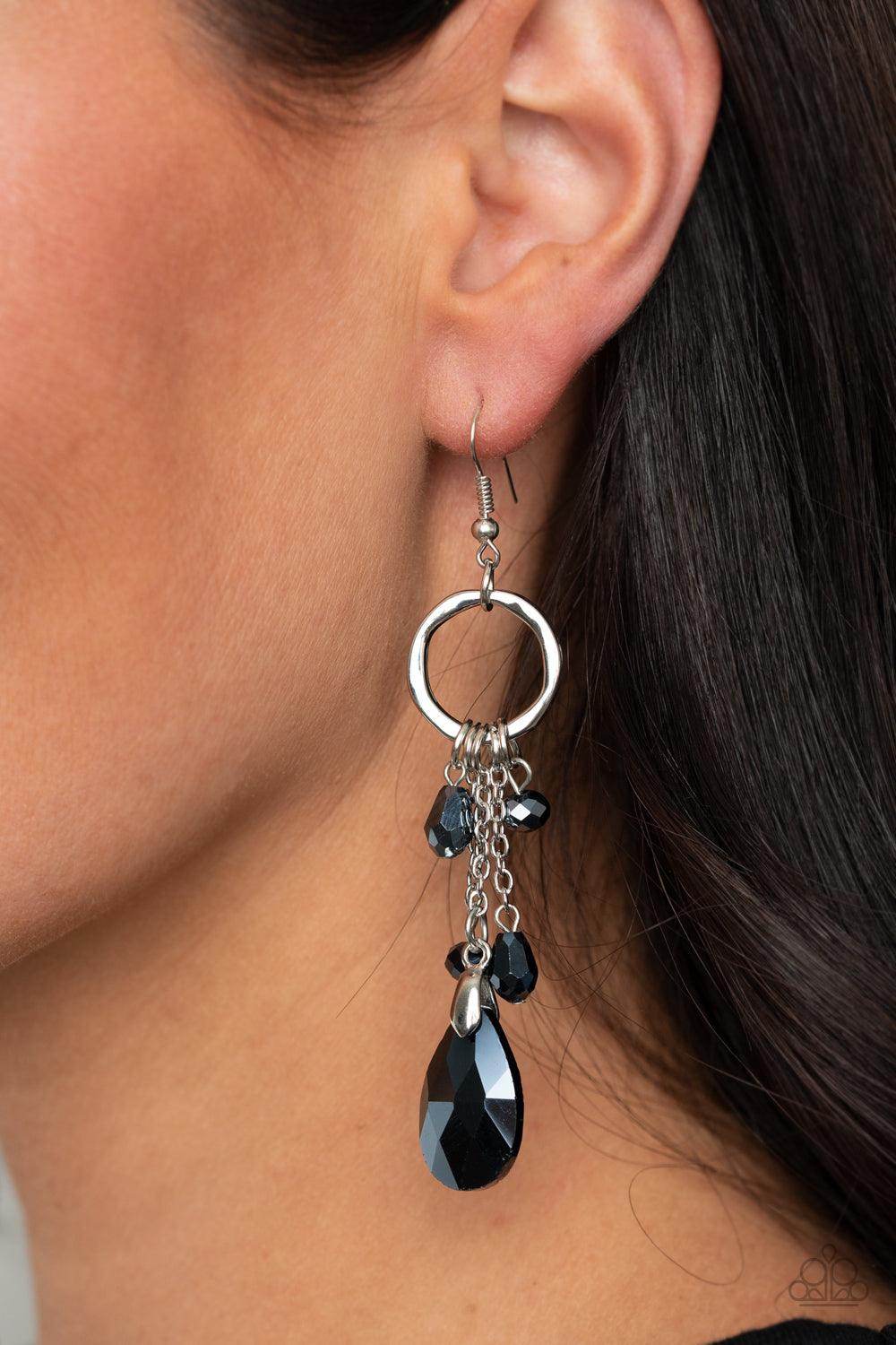Attached to sections of shimmery silver chains, a mismatched collection of metallic blue crystal-like beads swing from the bottom of a hammered silver hoop for an elegantly exaggerated look. Earring attaches to a standard fishhook fitting.