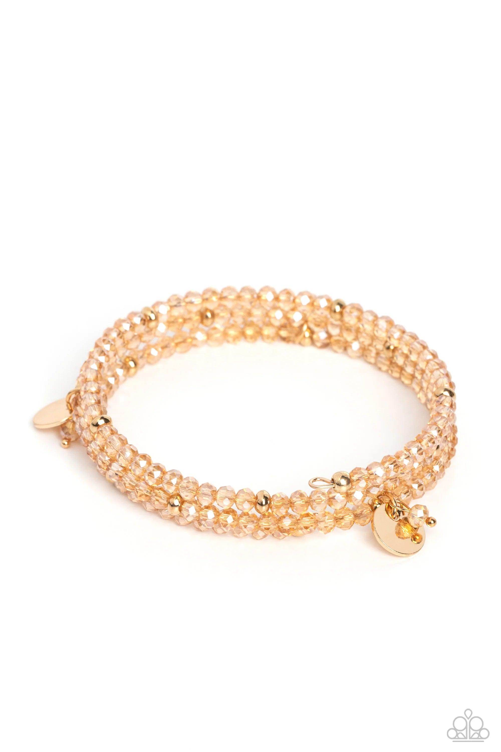 A dazzling collection of glassy gold beads, gold studs, and gold discs are threaded along a coiled wire, creating a blinding infinity wrap style bracelet around the wrist.
