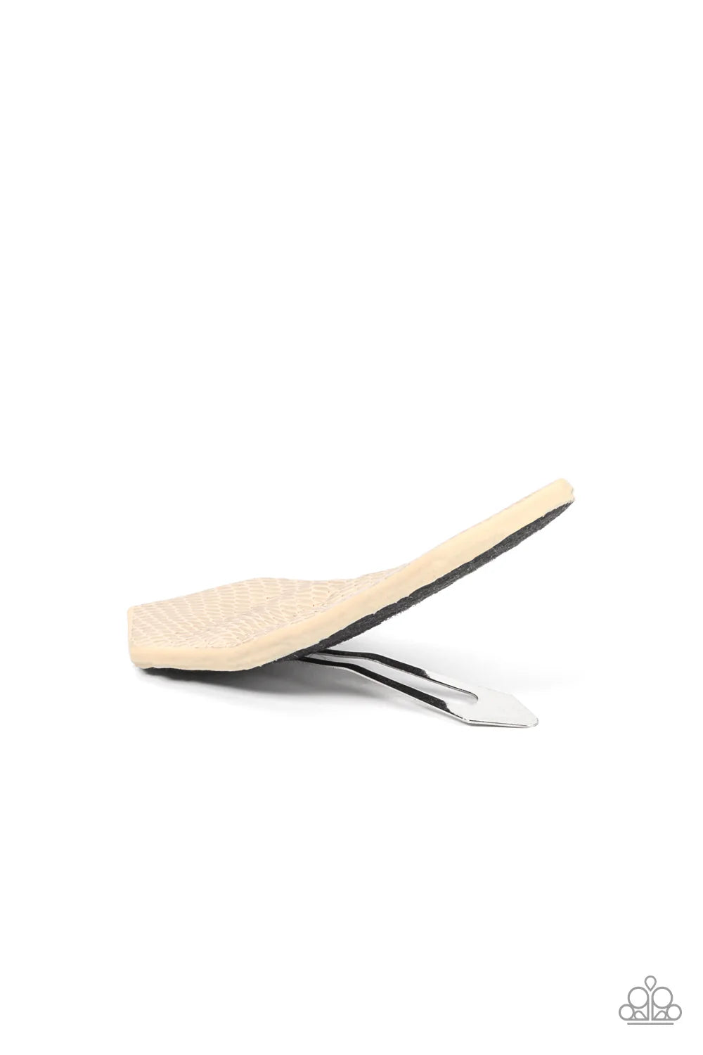 A glimmering gold snakeskin pattern is stretched across a rectangular hexagon frame creating a futuristic style. Features a standard snap hair clip on the back.
