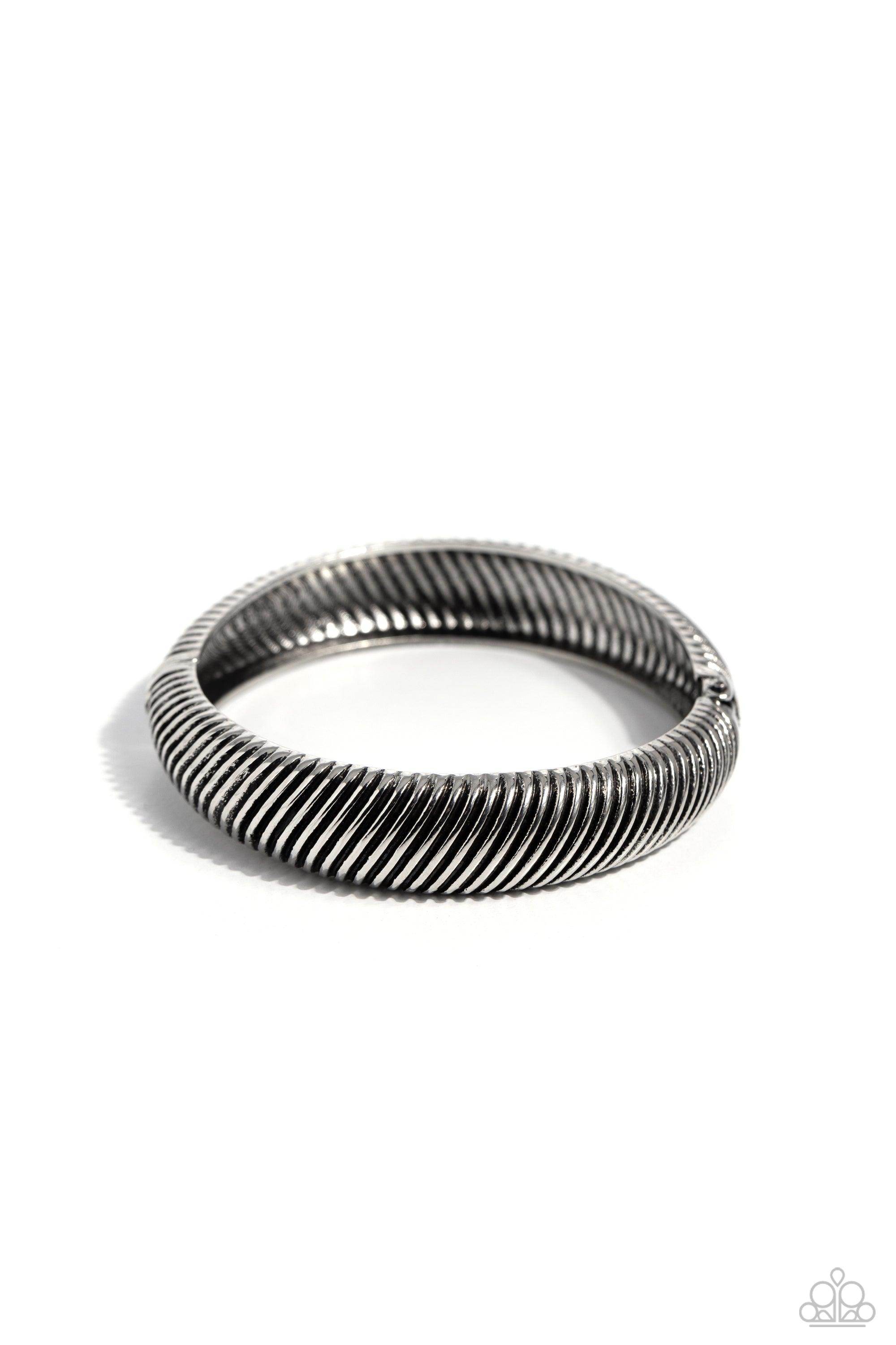 Etched in linear textures, curved rows of silver, fashioned after jailhouse stripes, wrap around the wrist for a bold industrial fashion. Features a hinged closure.