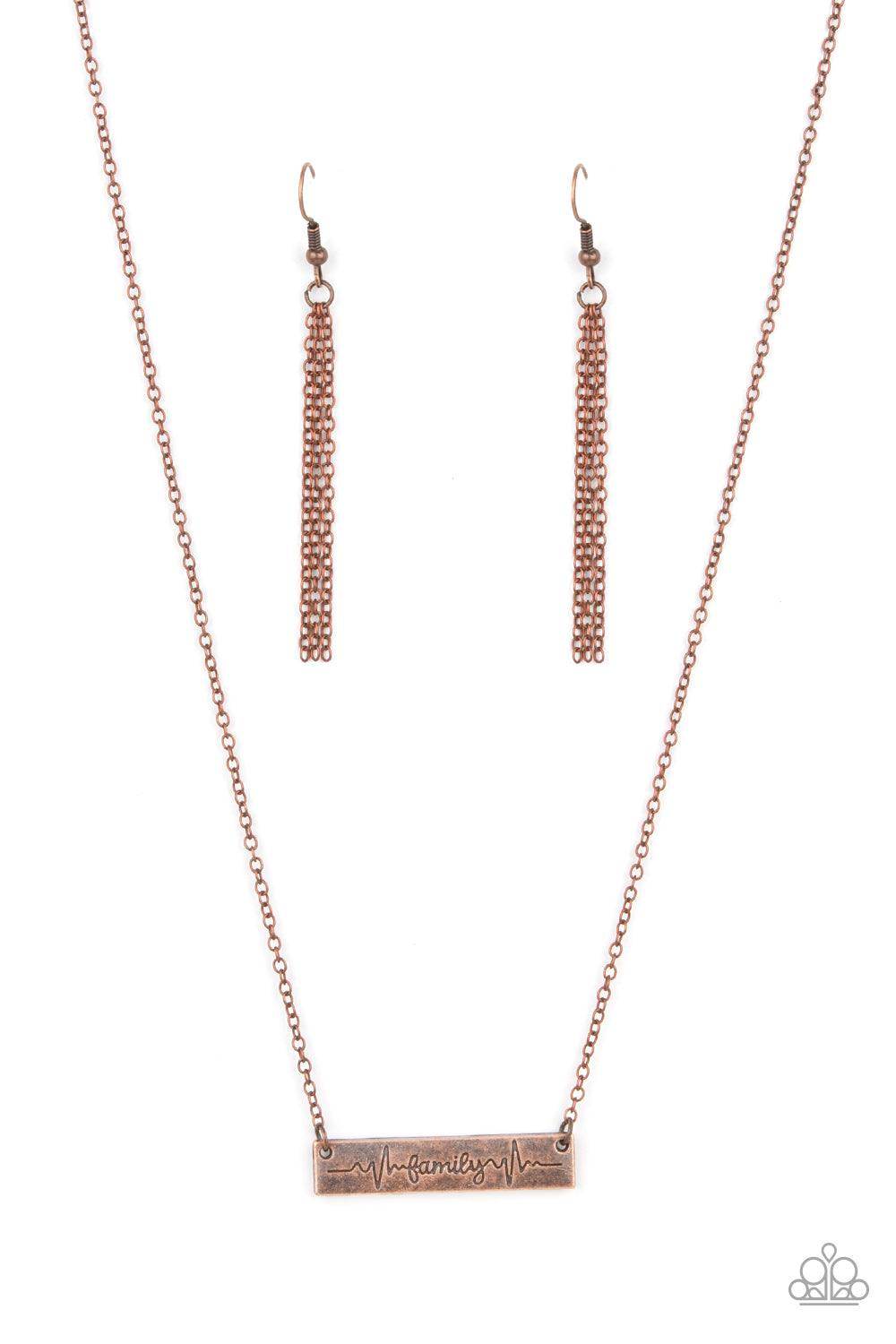 The word "Family," is inscribed between symbolic life lines on a rectangular copper plate creating an affectionate keepsake on a dainty copper chain below the collar. Features an adjustable clasp closure.