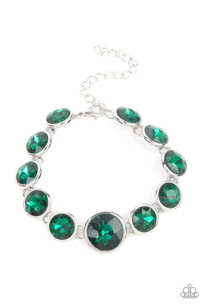 Featuring sleek silver fittings, an oversized collection of sparkly green gems delicately link around the wrist. The centermost gem is slightly larger than the rest, adding a glamorous finish. Features an adjustable clasp closure.