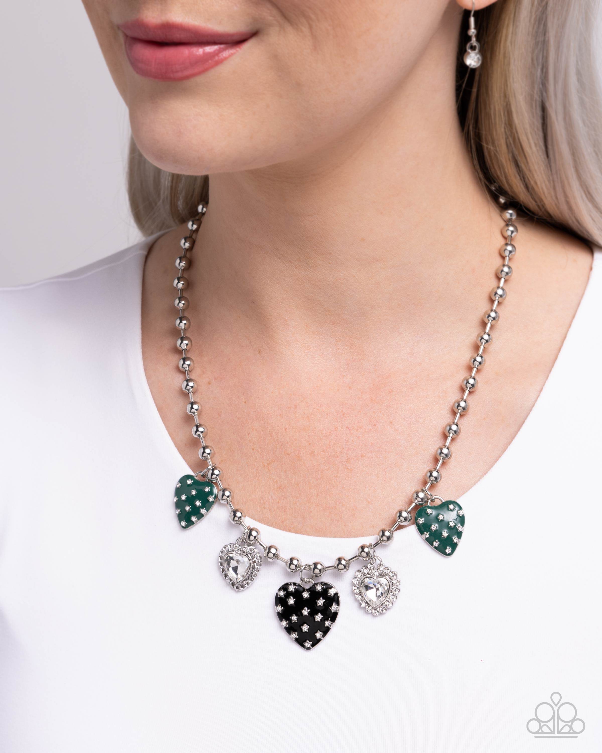 Infused along a bold industrial ball chain, a variety of heart charms rest below the neckline. Dotted with white rhinestone stars, black and Aventurine heart padlock charms in varying sizes alternate with a white heart gem pressed in a silver lacy border and a white heart gem pressed in a border of white rhinestones for a shimmery sweet design. Features an adjustable clasp closure.