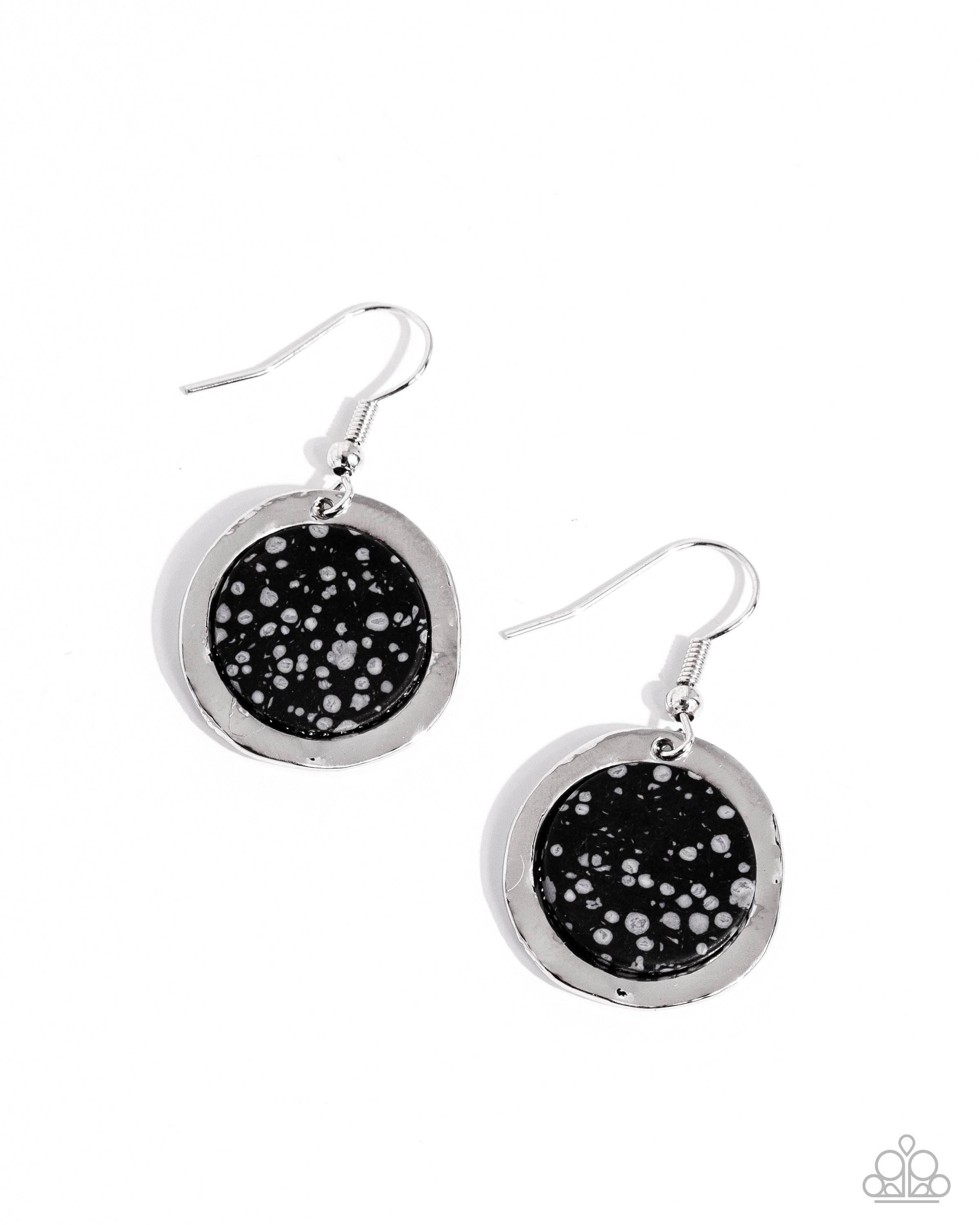 Pressed into a thick circular frame, a black and white-spotted stone dangles from the ear for an elegantly earthy display. Earring attaches to a standard fishhook fitting. As the stone elements in this piece are natural, some color variation is normal.
