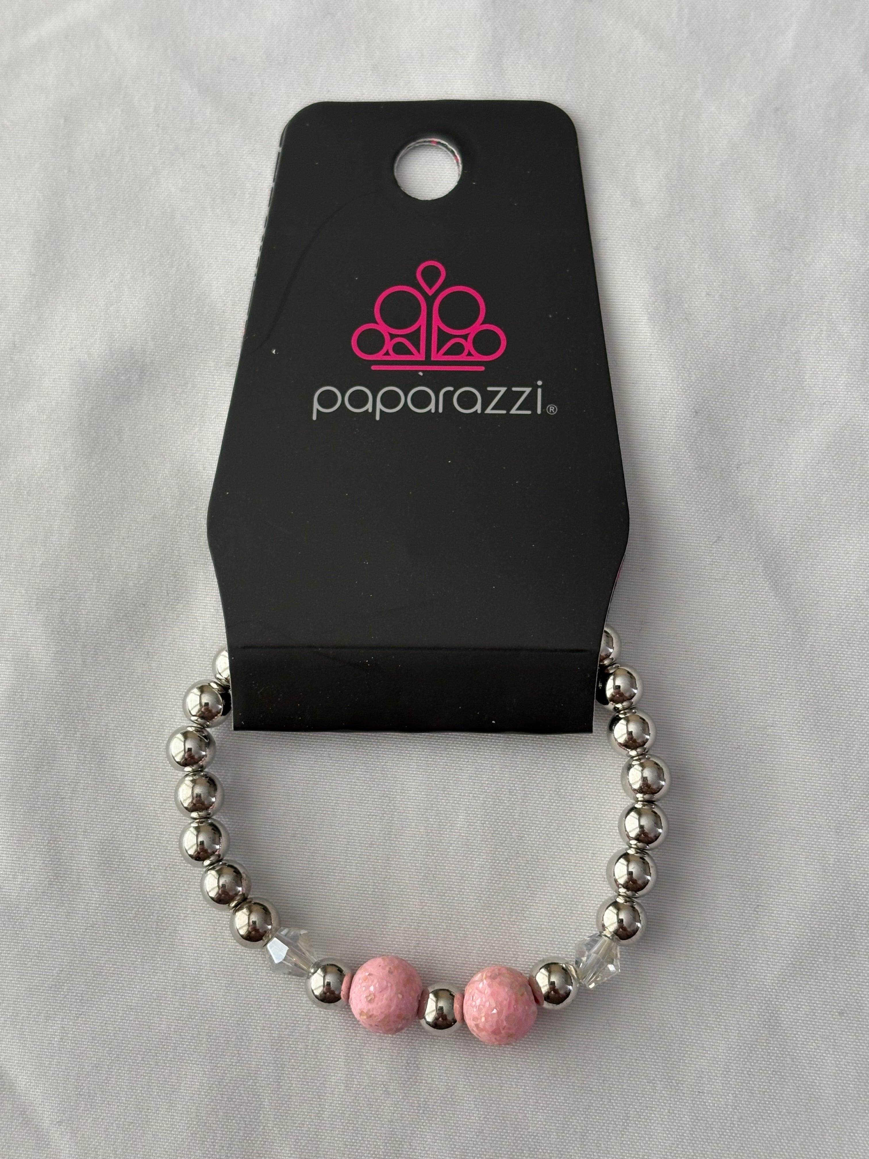Bracelet with silver beads and two pink beads.