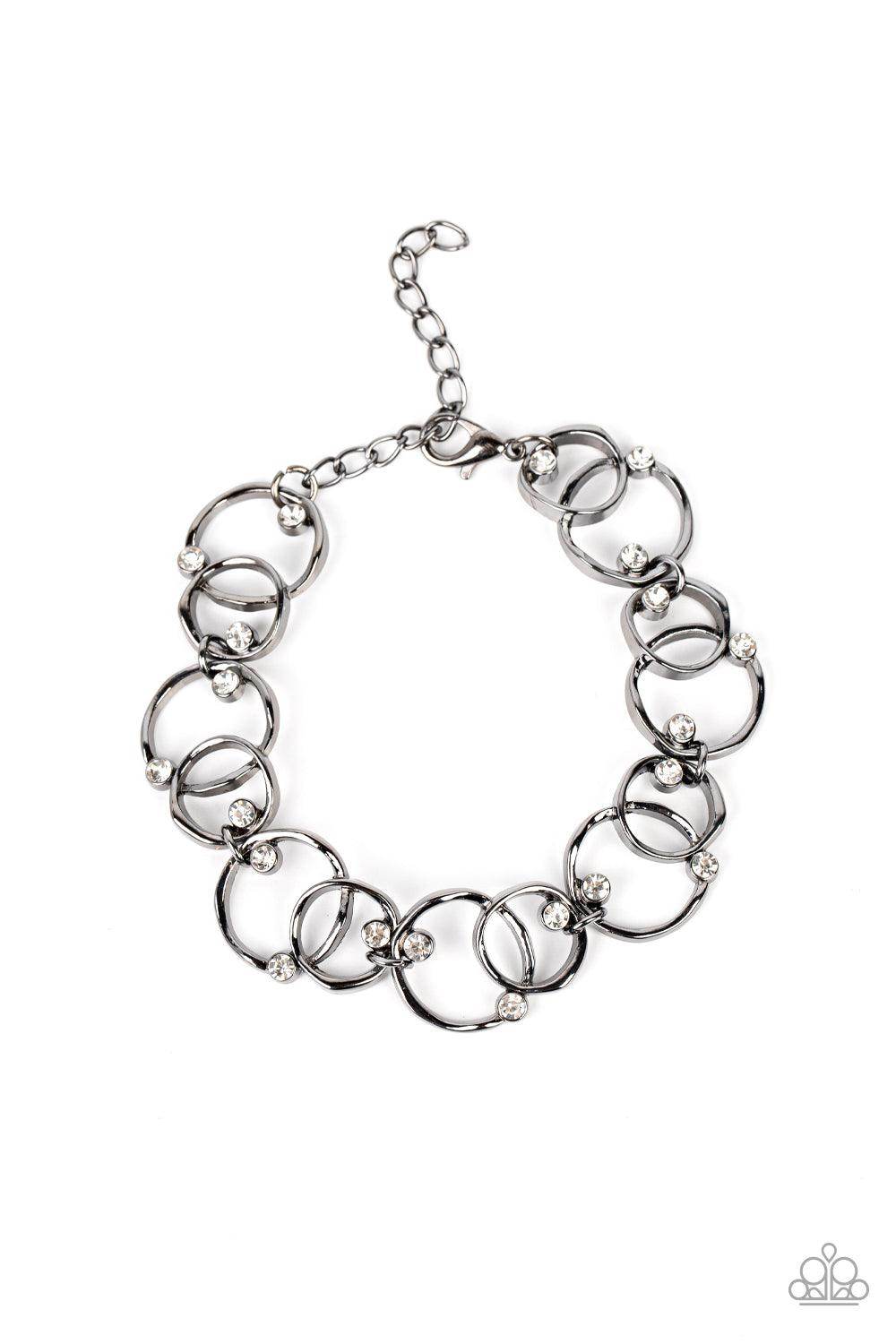 Sporadically dotted in glassy white rhinestones, asymmetrical pairs of overlapping gunmetal rings delicately link around the wrist for a dizzying display of industrial refinement. Features an adjustable clasp closure.